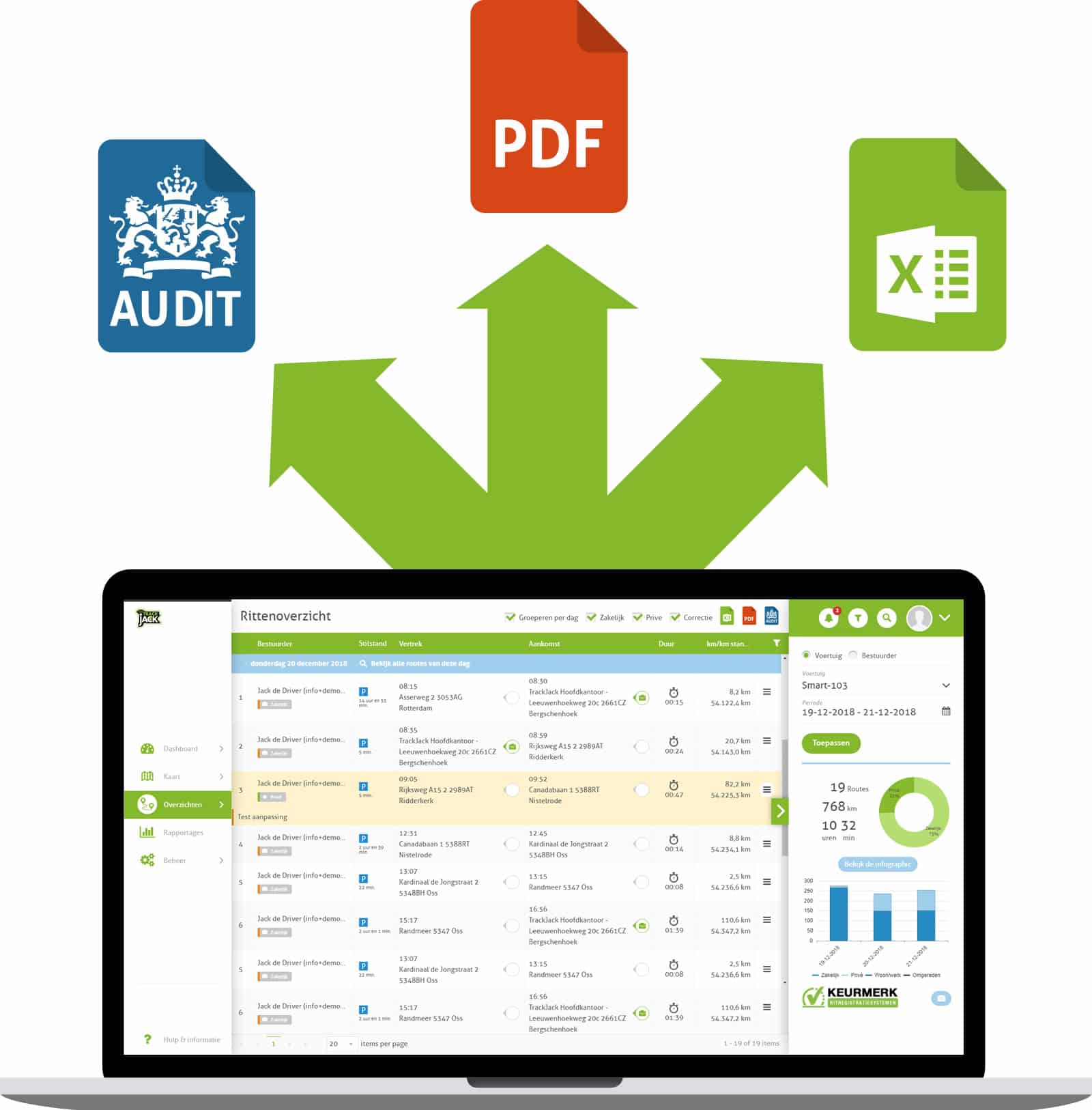 Het kilometerregistratiesysteem van TrackJack registreert alle ritten met behulp van GPS. Al uw gereden ritten worden vervolgens automatisch verstuurd naar uw online account. Zo kunt u altijd via de computer of app bij uw ritgegevens. Ook een rapportage of uitdraai van de gegevens is zo gebeurd. Ons systeem voldoet bovendien aan alle eisen van de Belastingdienst!