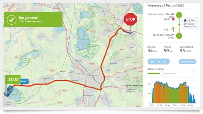 Beheer uw wagenpark door de rittenregistratie snel en eenvoudig in te zien en bekijk de laatst gereden route. U heeft inzicht in o.a. de totale reisduur, afstand en gemiddelde snelheid. Bekijk of de kortste route afgelegd is en of dat efficiënter had gekund. Bereken daarnaast hoe lang het nog rijden is tot het volgende adres met behulp van onze routeplanner.
